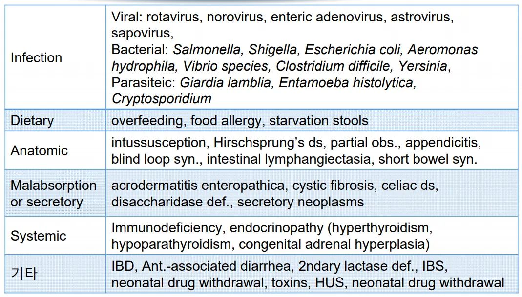 매우 다양. 급성 설사 바이러스 감염이 가장 흔함