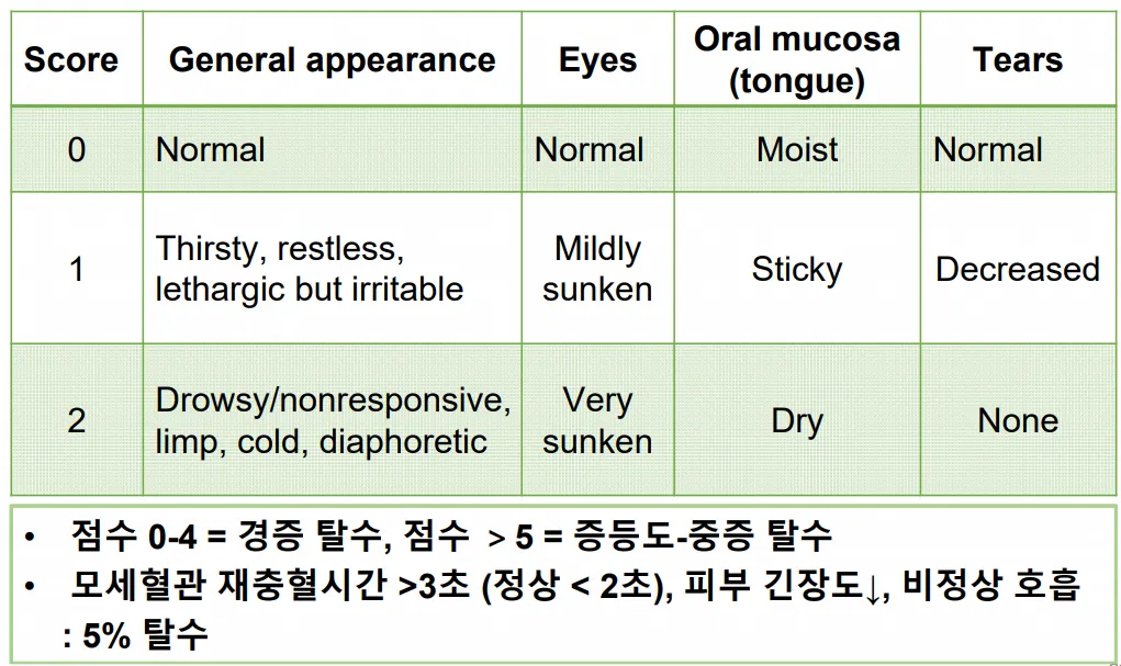 5 이상 : 중증도 ~ 중증 (general appearance, eyes, oral mucosa, tears)