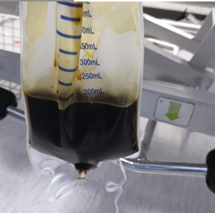 acute suppurative cholecystitis 환자에서 SIRS로인해 PTGBD를 먼저 시행한 후 배액된 담즙 사진 및 이에 대한 소견입니다.