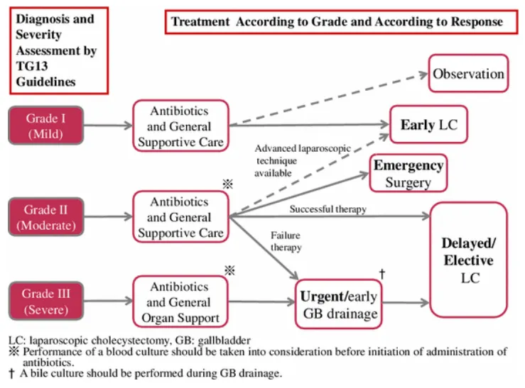 “Grade I” 급성 담낭염은 “Grade III” 또는 “Grade II” 급성 담낭염의 기준에 해당하지 않음. 이는 장기 기능 이상이 없고 담낭에 경미한 염증 변화만 있는 건강한 환자에서 발생하는 급성 담낭염으로 정의될 수 있으며, 담낭 절제술은 안전하고 낮은 위험을 가진 수술적 절차로 간주됩니다.
