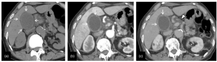 괴사성 담낭염의 전형적인 컴퓨터 단층촬영(CT) 이미지. 70대 여성, 괴사성 담낭염(급성 비결석성 담낭염). 동적 조영증강 CT (a, 일반; b, 초기 단계; c, 평형 단계). 일반 CT에서 담낭의 확대, 담낭 벽의 두꺼워짐, 담낭 장막 아래의 부종성 병변이 나타납니다(화살표). 조영증강 CT (b, c)에서는 담낭 벽의 불규칙성과 부분적인 조영 증강 부족이 보이며(화살표) 이것이 괴사성 담낭염의 특징적인 소견입니다. 초기 단계에서 간 실질의 일시적인 염색 (b)과 간십이지장 인대의 부종성 변화 (c, 화살표)가 나타나며, 이는 염증의 확산을 시사합니다.
