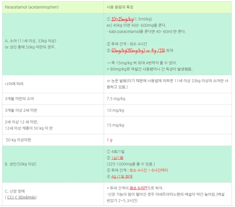 AAP 1g | 중등도 | 15분 내외 | 4~6시간 | 중증 간질환(특히 알코올중독자) | 간 독성, 드물게 피부 발진 |