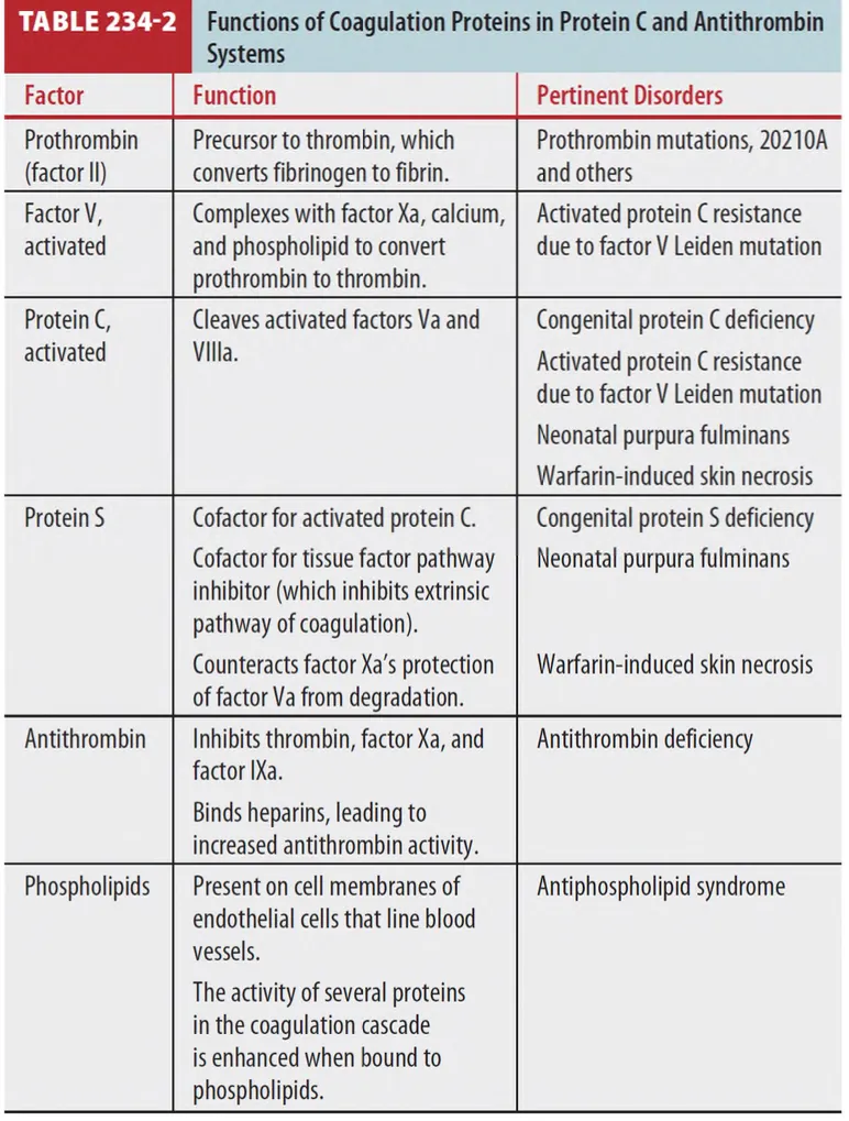 * 두가지 주요 항 혈전 pathway : Antithrombin, protein C (Table 234-2)