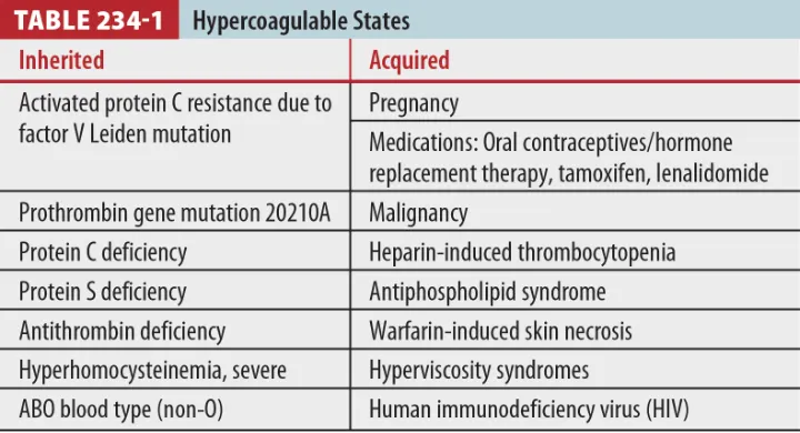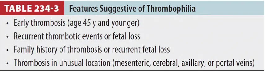 (1) Thrombophilic 질환은 응급실에서 진단은 드물다. thrombophilia가 있는 환자에서 혈전증의 high risk를 인지하고 과응고 상태를 의심할 수 있는 적절한 진단적 정보를 얻는 것이 중요 (Table 234-3)