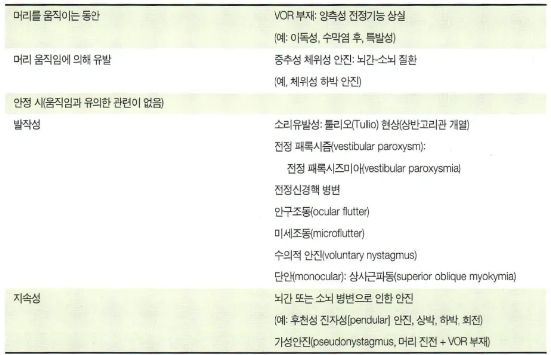 머리를 움직일 때 악화되면 전정기관 기원일 가능성이 있다.
