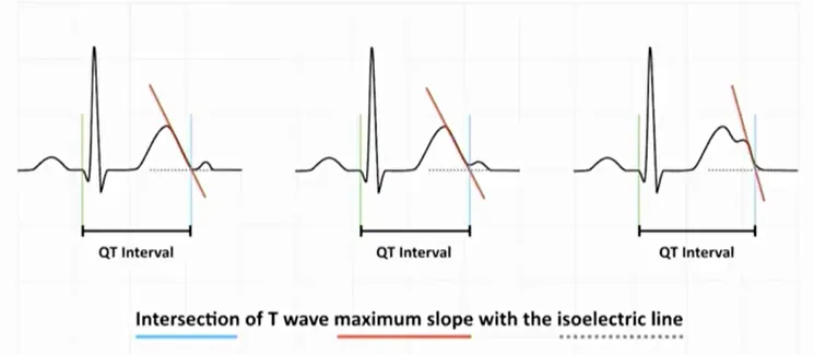 T wave (또는 T와 합쳐진 U) 의 Maximal Downslope와 baseline이 만나는 지점을 T wave의 끝으로 한다.