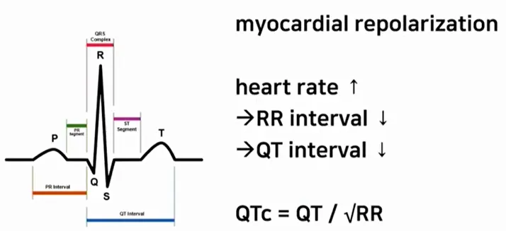 HR 증가하면 RR interval 감소하고 QT interval 도 감소하므로, 보정값인 QTc를 사용한다.