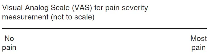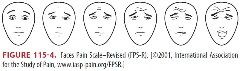 (no pain과 most pain이 양 끝에 표시되어 있고, 어린이가 pain level 표시, 거리 측정해서 level 표기)