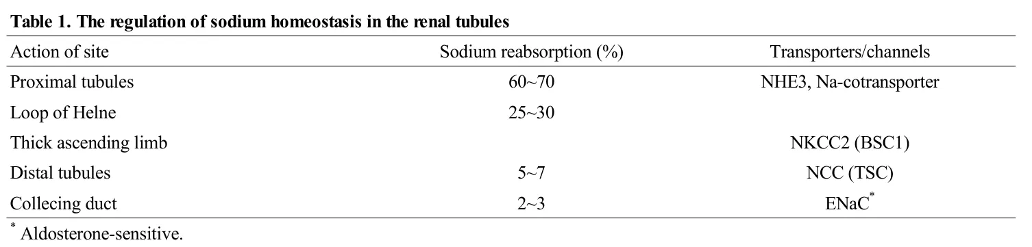 사구체를 통하여 여과된 나트륨을 신장 요세관의 분절에 따라 특이적으로 분화되어 있는 물질전달체(transporter)를 통하여 재흡수함으로써 나트륨 배설을 조절