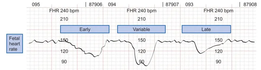 (2) 응급실 의사는 심장-자궁수축 모니터에서 나타나는 태아 곤란 패턴에 익숙해야 한다.