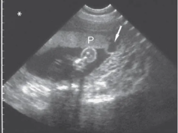 B. 태반 박리. 18주 산모, 시상단면에서 태반 뒤쪽의 혈종 (H). 태반은 (P) 뒤쪽 벽에 위치한다.
