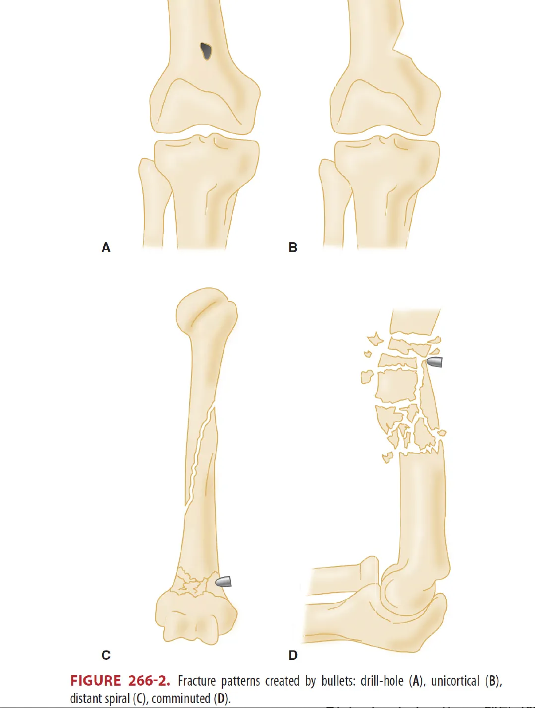 * 그림 266-2. Low energy 총상에서 발생 가능한 4가지 유형의 골절을 나타냄.
