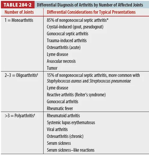 Septic arthritis는 붓고 열감이 동반된 관절통에서 가장 중요하게 고려되어야 함.