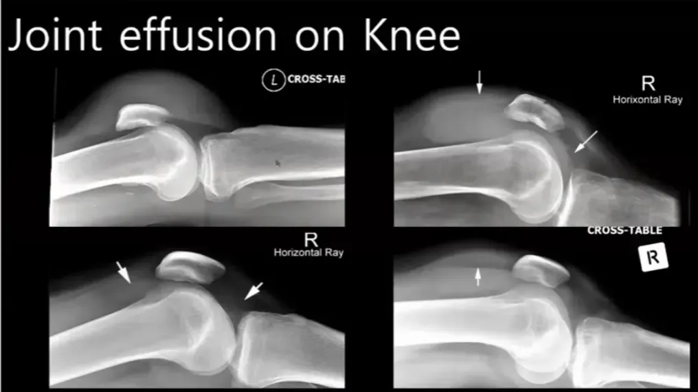 조인트 이퓨전이 양이 많을 경우, 엑스레이에서 명확하게 나타나며, 적은 경우에도 파텔라 위쪽에서 발견될 수 있다. 77