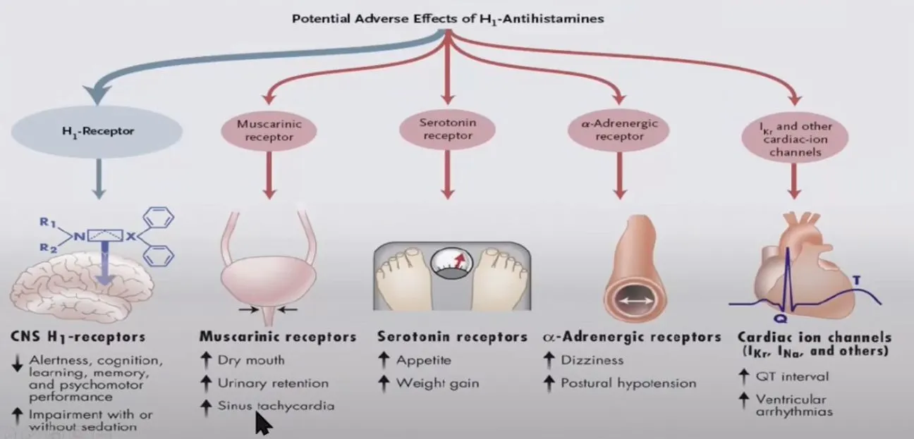 H1 리셉터 CNS 작용으로 인한 졸림이 흔함.