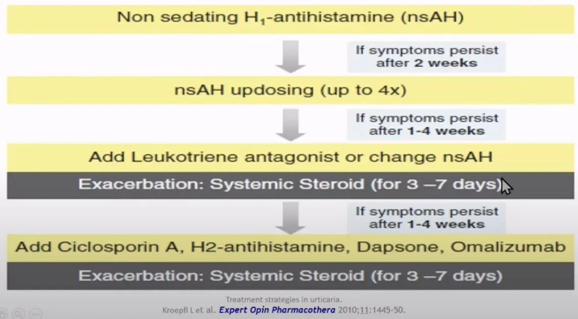 2세대 항히스타민제가 충분하지 않으면 4배까지 증량할 것을 권고함.