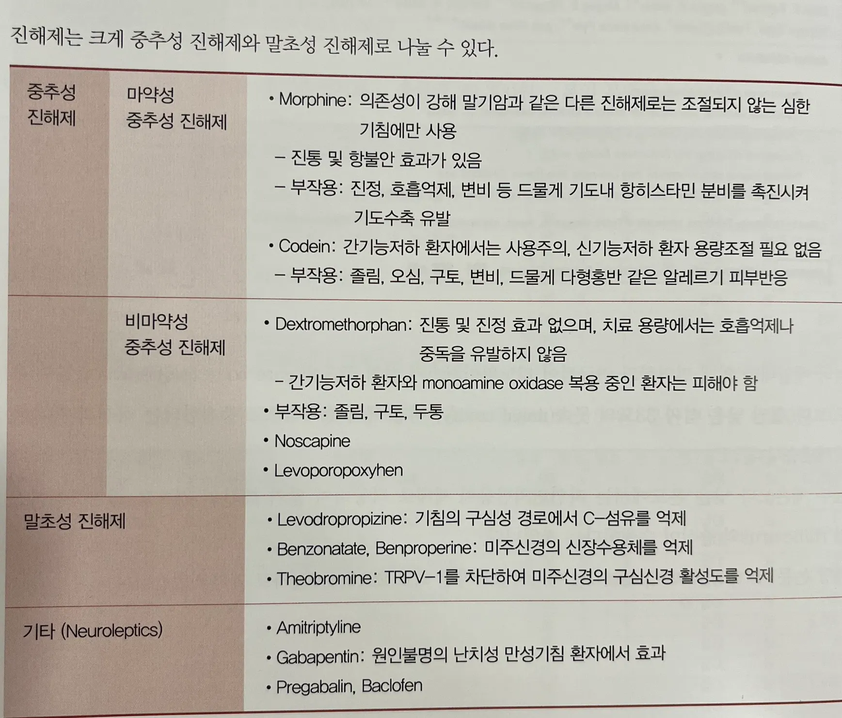 ◦ 마약성 중추성 진해제: 모르핀(morphine), 코데인(codein)