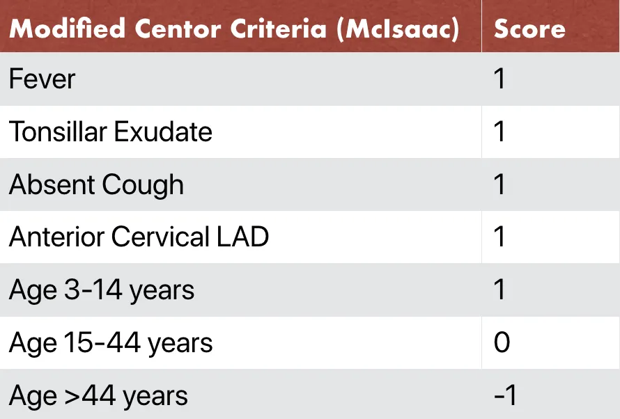 Centor 점수체계 : 3점 이상이면 배양검사 및 항생제 치료