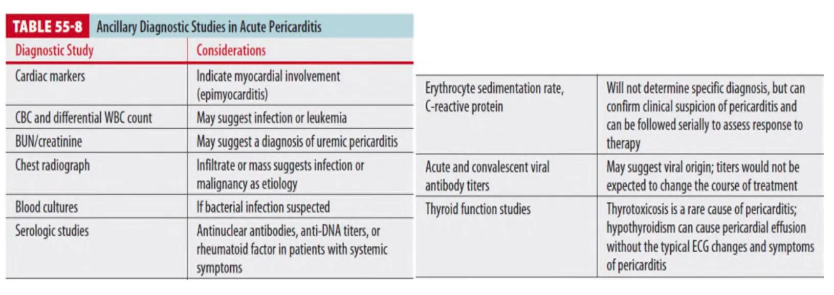 2 Echocardiography는 acute pericarditis와 pericardial effusion의 진단, 확진, serial f/u의 일차 검사이다.