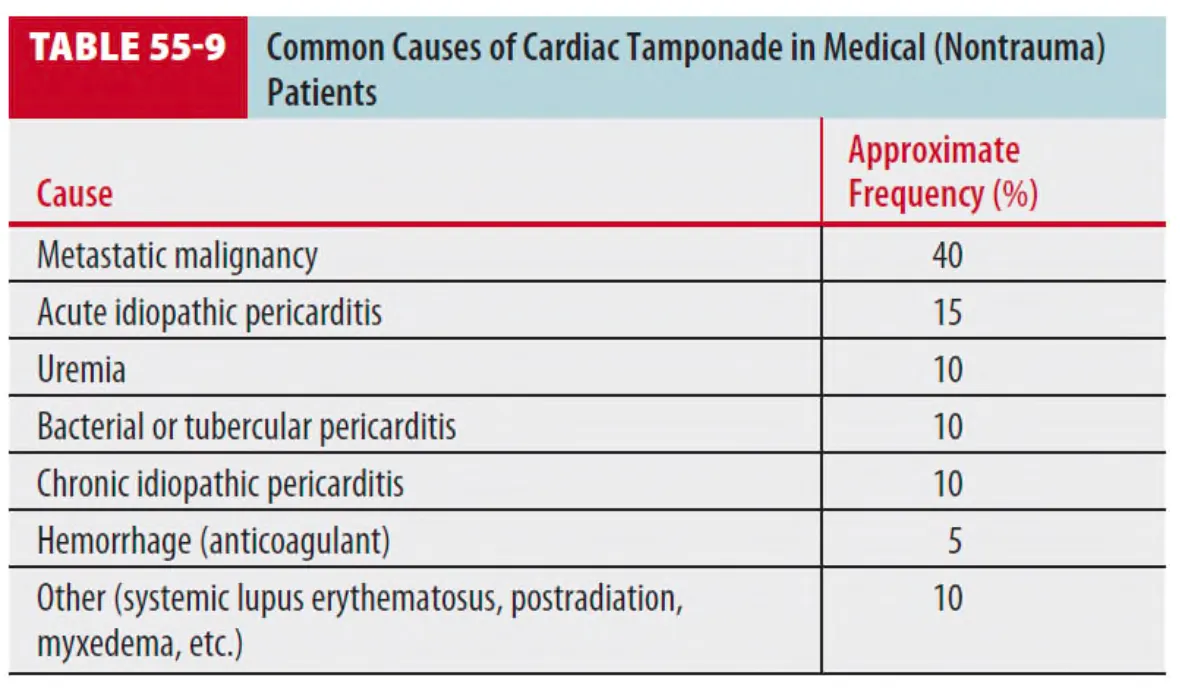 4 비외상성 cardiac tamponade의 원인으로는 metastatic malignancy가 가장 흔하다.