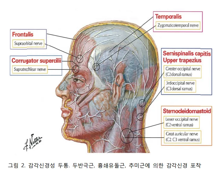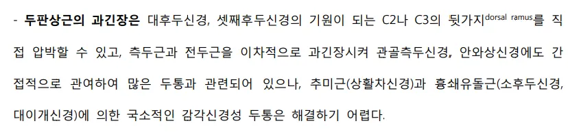 대후두신경greater occipital nerve : dorsal ramus of C2 과 셋째후두신경 3rd occipital nerve : dorsal ramus of C3을 조이거나 압박하여 후두부 중심의 감각신경성 통증을 일으킬 수 있다.