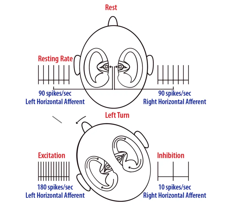 예를 들어, 왼쪽으로 머리를 돌린다면 왼쪽의 전정기관(반고리관, 이석기관)은 활성화되고, 반대쪽인 오른쪽 전정기관은 억제되는 상반된 모습을 보인다 (push-pull arrangement 또는 push-pull system)