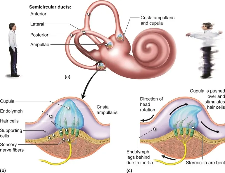 반고리관 안에는 내림프액(Endolymph)으로 채워져 있는데, 이 내림프액은 머리의 회전으로 반고리관에 움직임이 발생하면 관성의 힘으로 뒤쪽에 머물게 있게 되는데, 이렇게 늦게 움직이는 내림프액은 마루(cupula)에 힘을 가하게 된다.