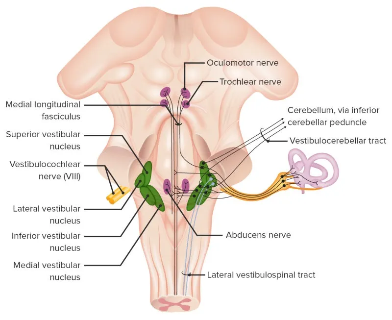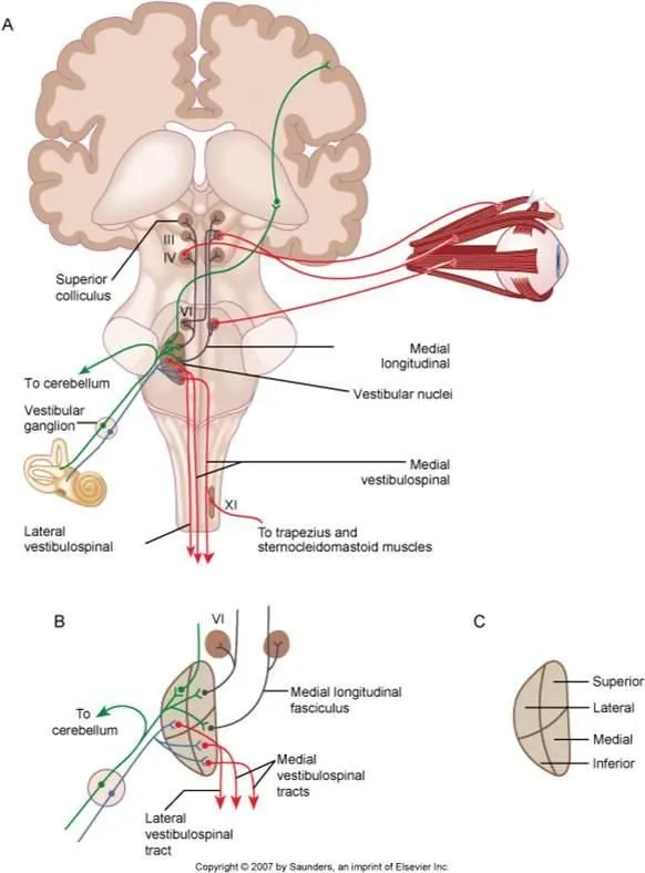 전정핵에서 받아들인 전정 정보는 특정 신경 경로를 따라 대뇌피질,눈돌림핵,척수 등으로 투사되어 눈과 자세 조절에 영향을 미칩니다.