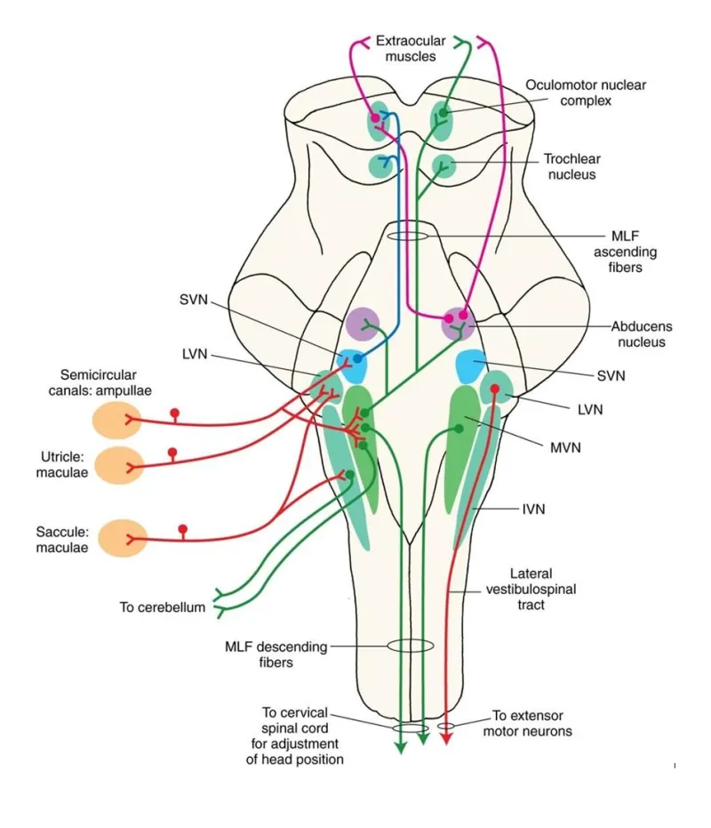 내측세로다발(MLF) 내림섬유들은 경추로 내려가 머리의 자세 조절에 기여하고, 오름섬유들은 눈을 움직이는 동안신경핵(눈돌림신경핵,oculmotor nucleus), 도르래신경핵(활차신경핵,trochlear nucleus), 외전신경핵(갓돌림신경핵,abducens nucleus)과 신경연접을 이루어 전정안구반사(전정눈반사,vestibulo-ocular reflex,VOR)를 조절하기도 합니다.
