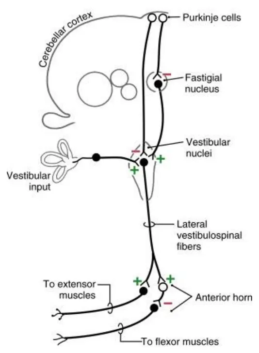 그것은 다시 전정척수로(vestibulospinal tract)를 통해 몸의 신전을 담당하는 근육들(척추기립근,둔근,햄스트링 등)에 영향을 미쳐 자세 조절에 중요한 역할을 한다.