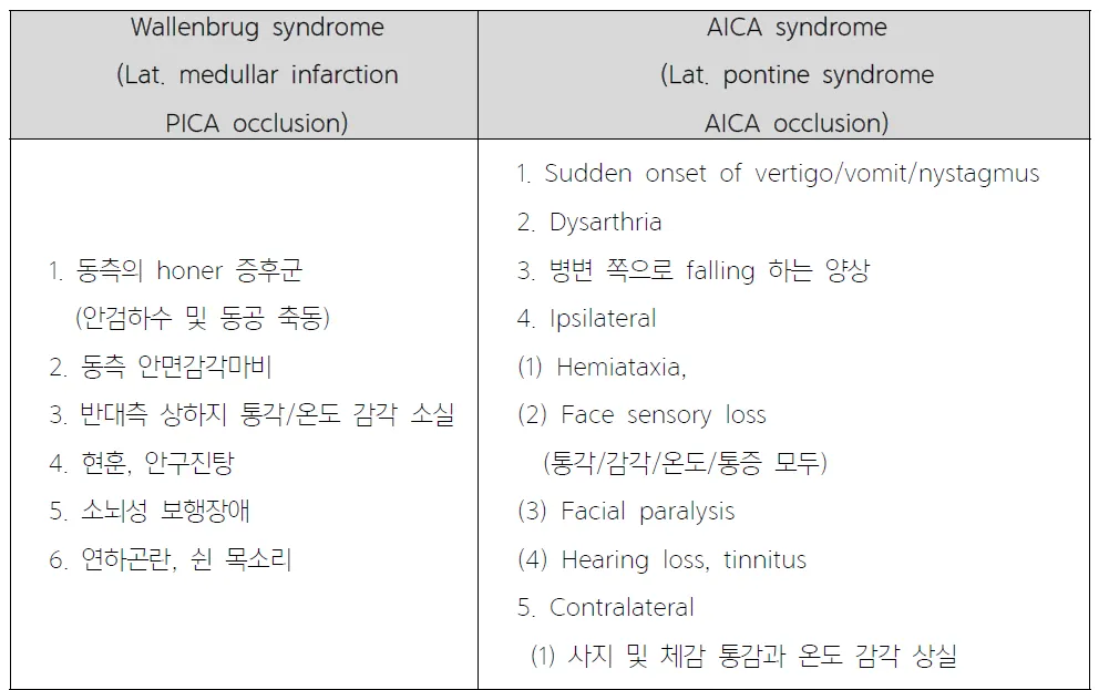 (1) 전형적 증상 : 운동실조(ataxia), 안진(nystagmus), 현훈(vertigo) altered mental status