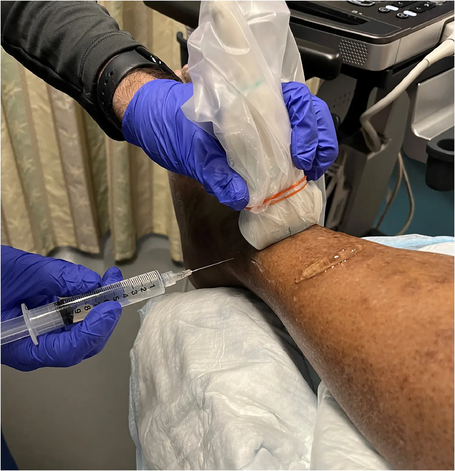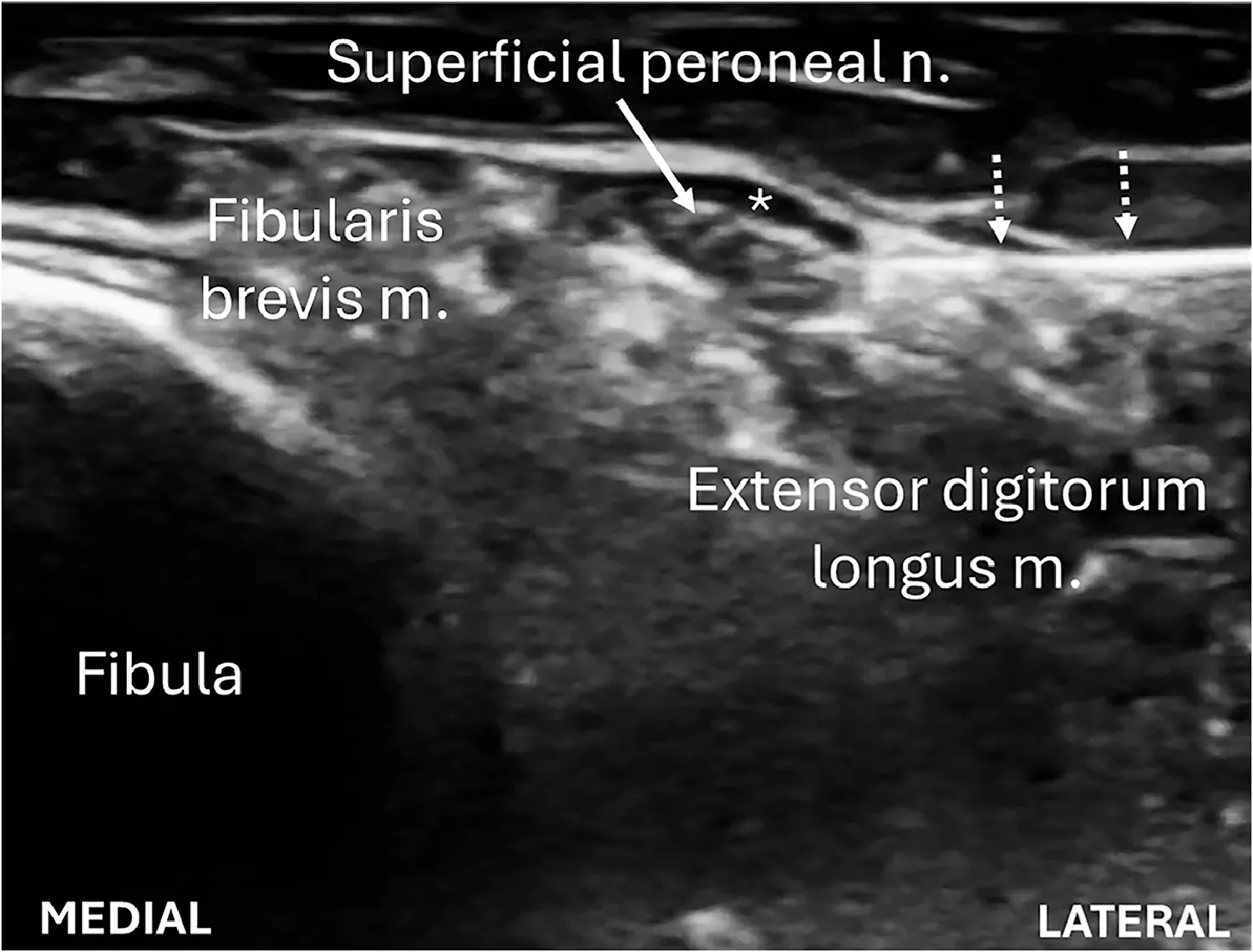 A superficial peroneal nerve block was performed under direct ultrasound guidance by our institution’s emergency medicine clinical ultrasound fellowship director, who had performed more than 100 ultrasound-guided regional anesthesia procedures. The patient was placed in the supine position with the left leg elevated on a towel roll to allow for an easier approach to the superficial peroneal nerve. The emergency medicine physician was positioned lateral to the patient’s left ankle with the ultrasound machine at the foot of the bed. Using a Mindray M-9 ultrasound machine (Shenzhen, China), a L4-12s high-frequency linear probe was positioned on the distal anterolateral aspect of the patient’s shin in transverse orientation to visualize the superficial peroneal nerve slightly lateral and superficial to the fibula (Figure 3). The nerve was initially visualized at the mid shin and followed distally to its most superficial position just proximal to the ankle where the block was performed.