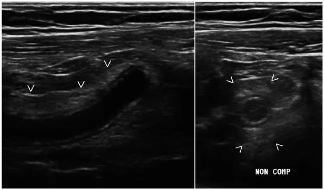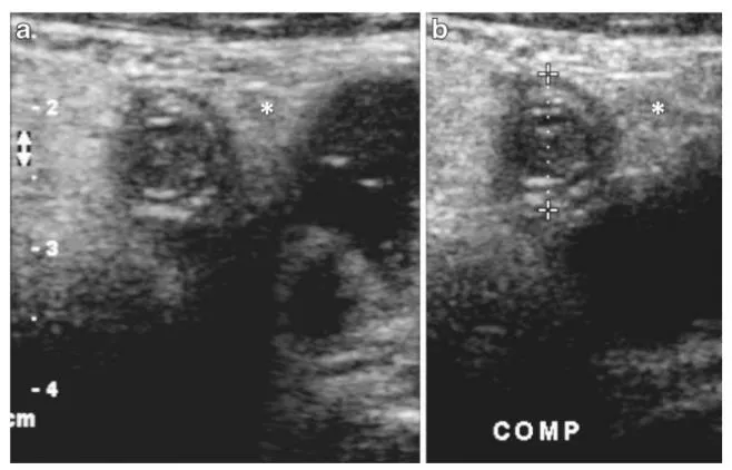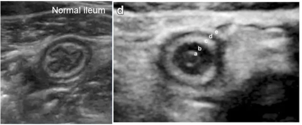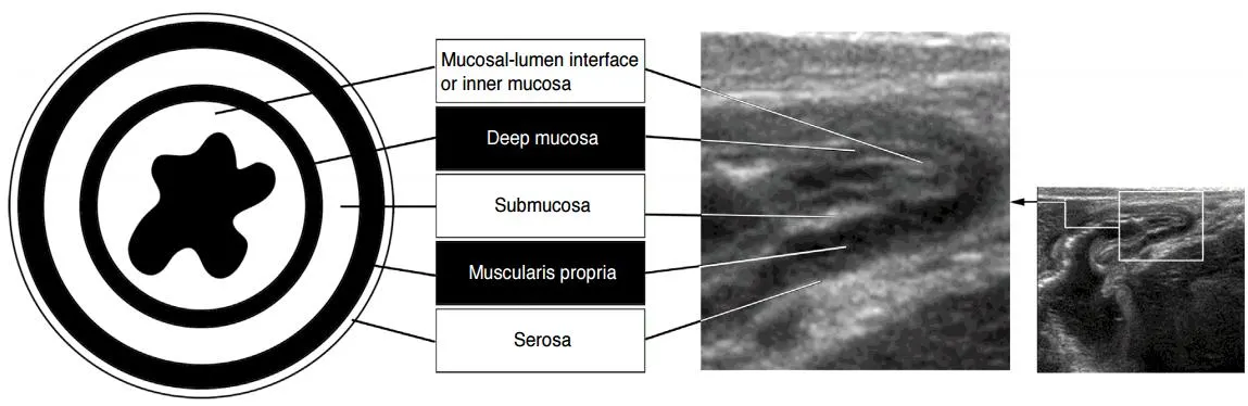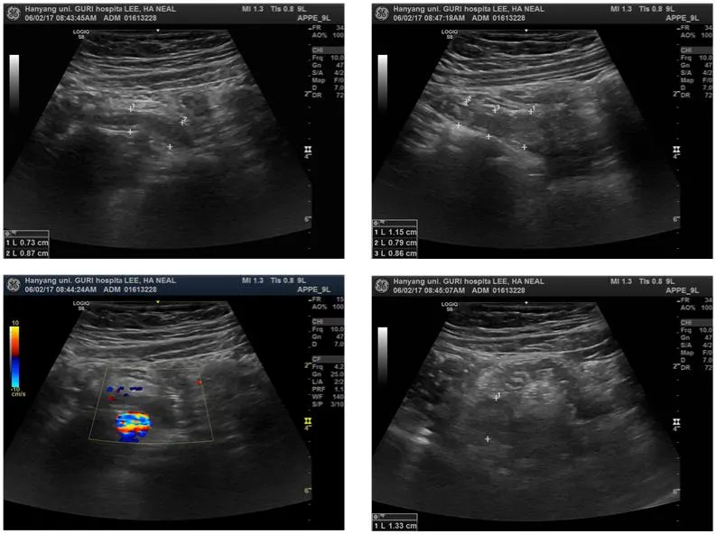 Ileum과 차이점 : Appendix는 inner hypoechogenic mucosa에 fold가 없음.