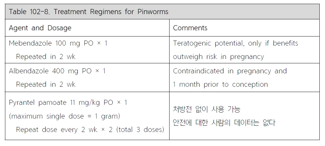 요충(Enterobius vermicularis)이 있는 환자는 항문 또는 질 가려움증을 호소하고 밤에 더 심하다 (암컷 요충이 장에서 빠져나와 회음부 피부에 알을 낳을 때)