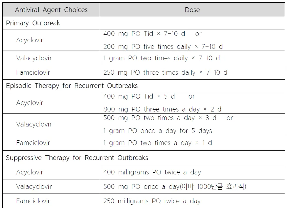 : 중증 질환이나 합병증이 있는 환자는 입원 및 IV acyclovir 치료가 필요할 수 있다