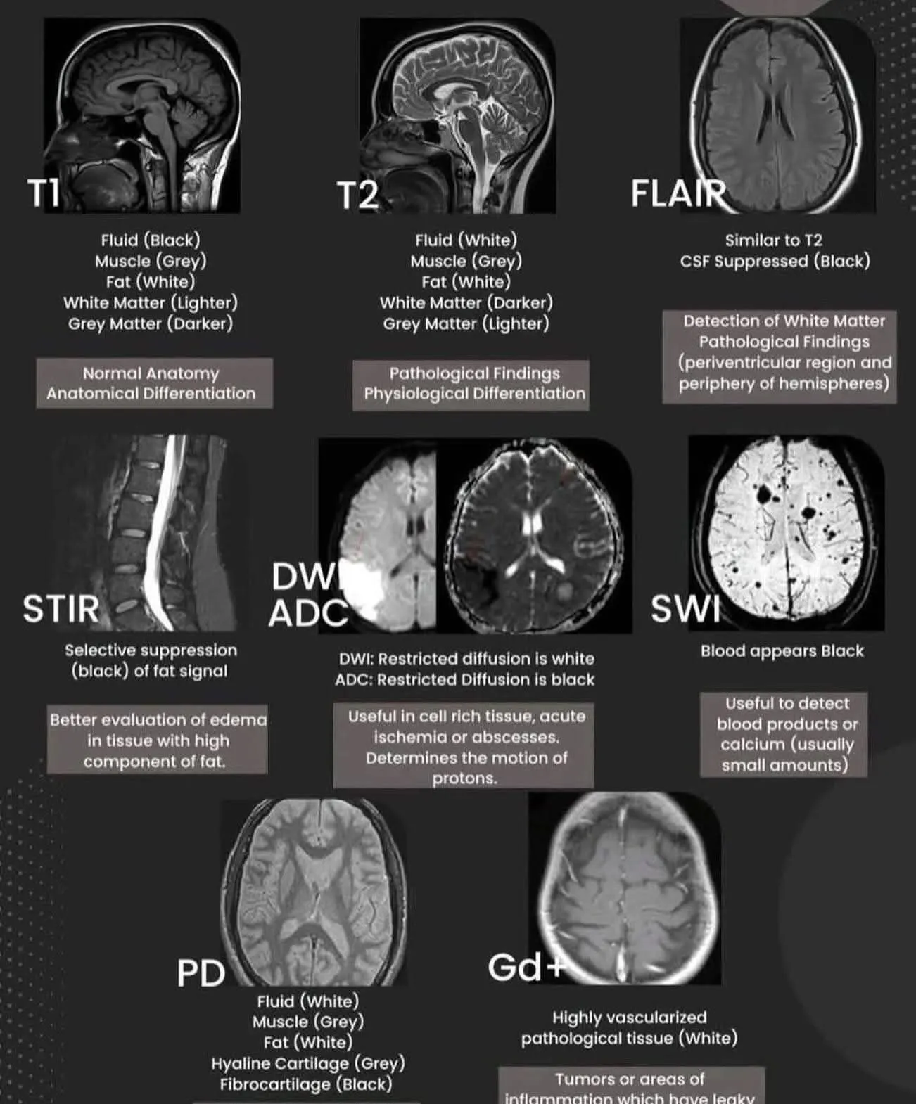 SWI : Blood가 검게 표시됨. Blood product나 칼슘 감지에 유용함