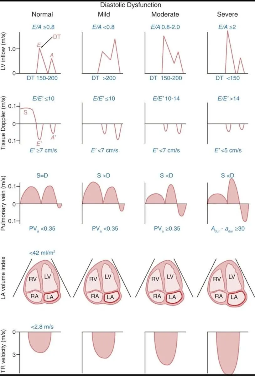 E/A < 0.8 + max E < 50 cm/sec 이면 LA pr 는 정상, I단계 이완기능 장애