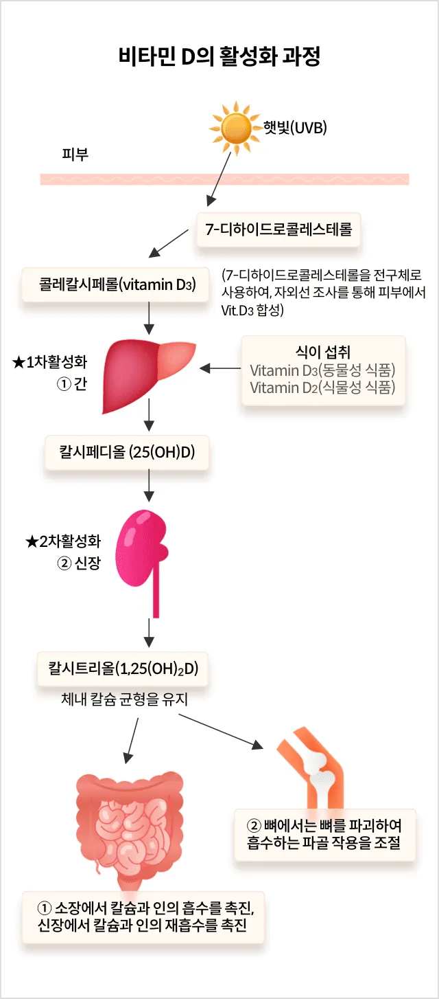 만성 질환: 만성 간질환, 만성 신질환 등이 동반되면 비타민 D 활성화에 문제를 일으킬 수 있음