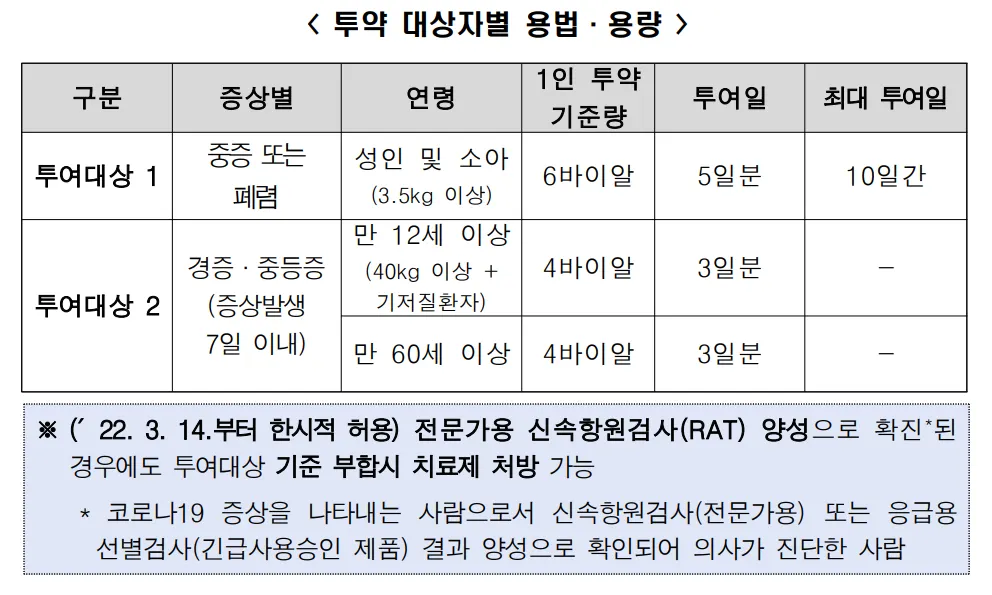 (1) 투여대상 1 : 치료제 처방 당시, 아래 기준을 충족하는 중증 또는 폐렴 환자
