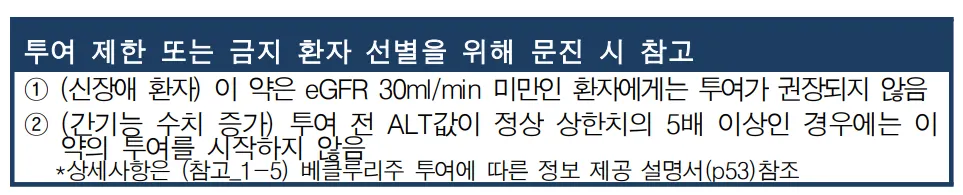 이 약을 투여하기 전에 간기능 및 신기능(eGFR 또는 혈청 크레아티닌) 검사를 실시하