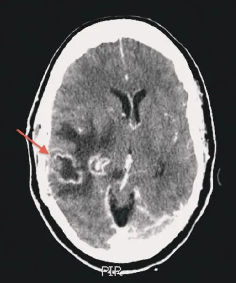 (1) Contrast CT – 조영증강된 ring shape 외피, 안으로 low density, 주변 brain의 edema