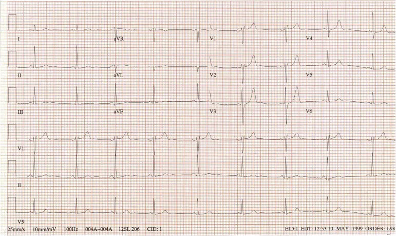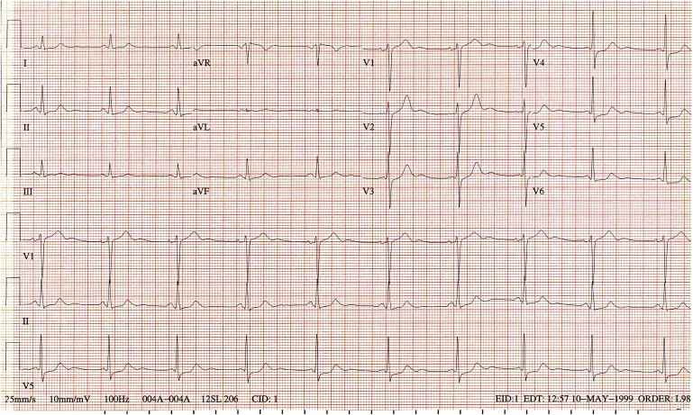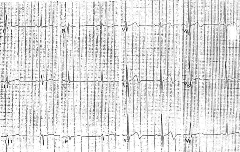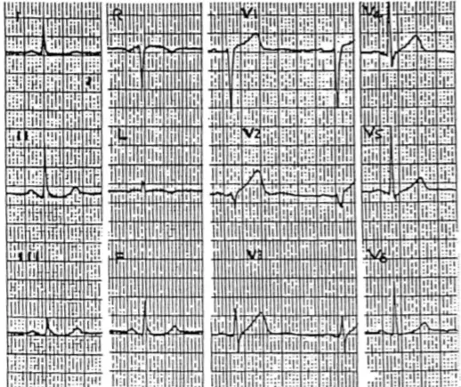 이 심전도에서도 V1의 T파가 V6보다 높다. Lead I, aVL에서 비정상적으로 낮은 T파가 보이며, anteroseptal leads에서는 양 다리가 벌어지고 (Wide based), 직선으로 이륙하듯이 상승하는 T 파가 보인다.