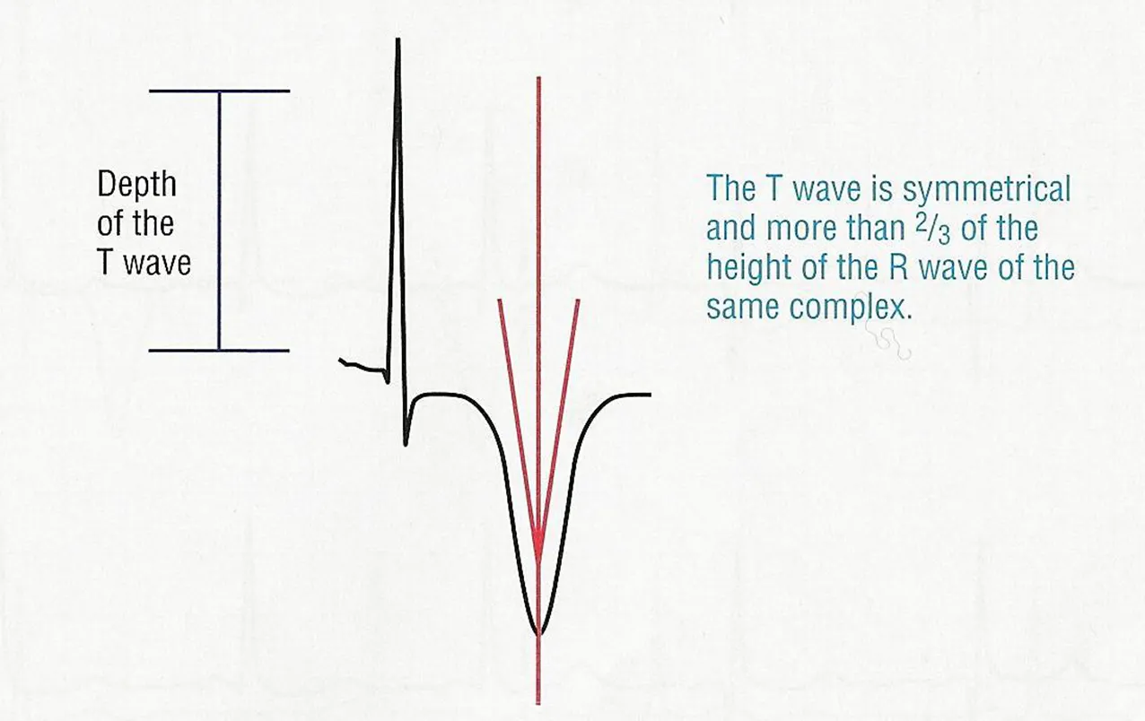 대칭성 T파는 비정상이며 허혈, 전해질 이상, CNS 이상 시 주로 나타난다.