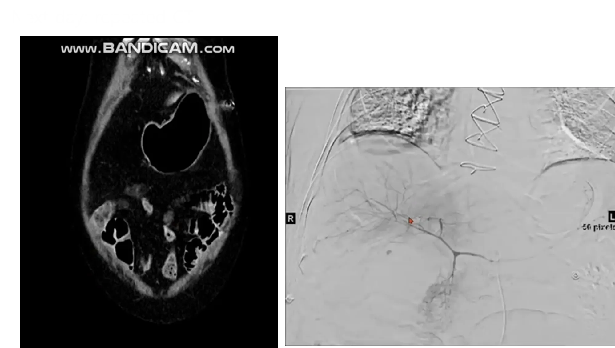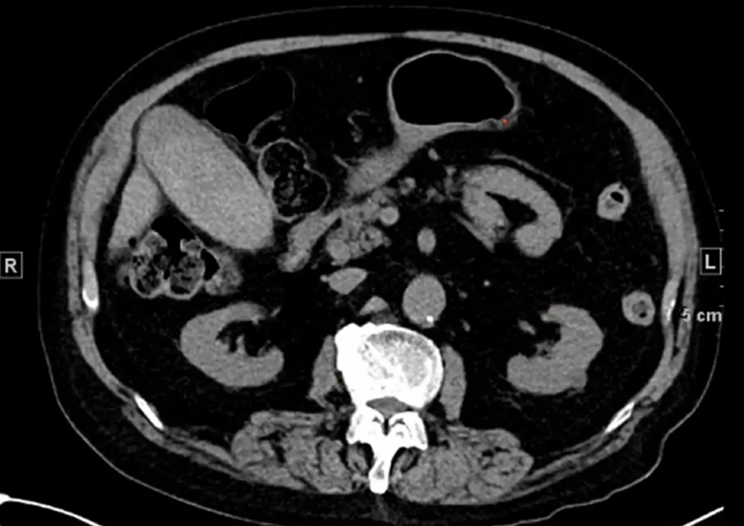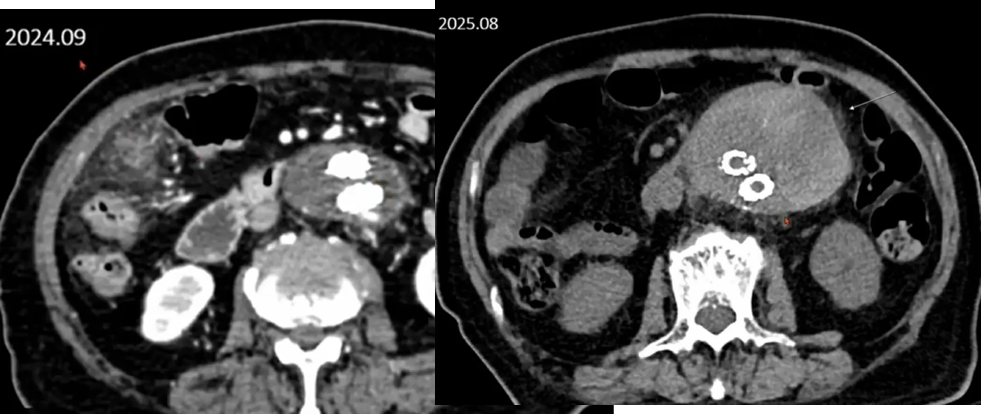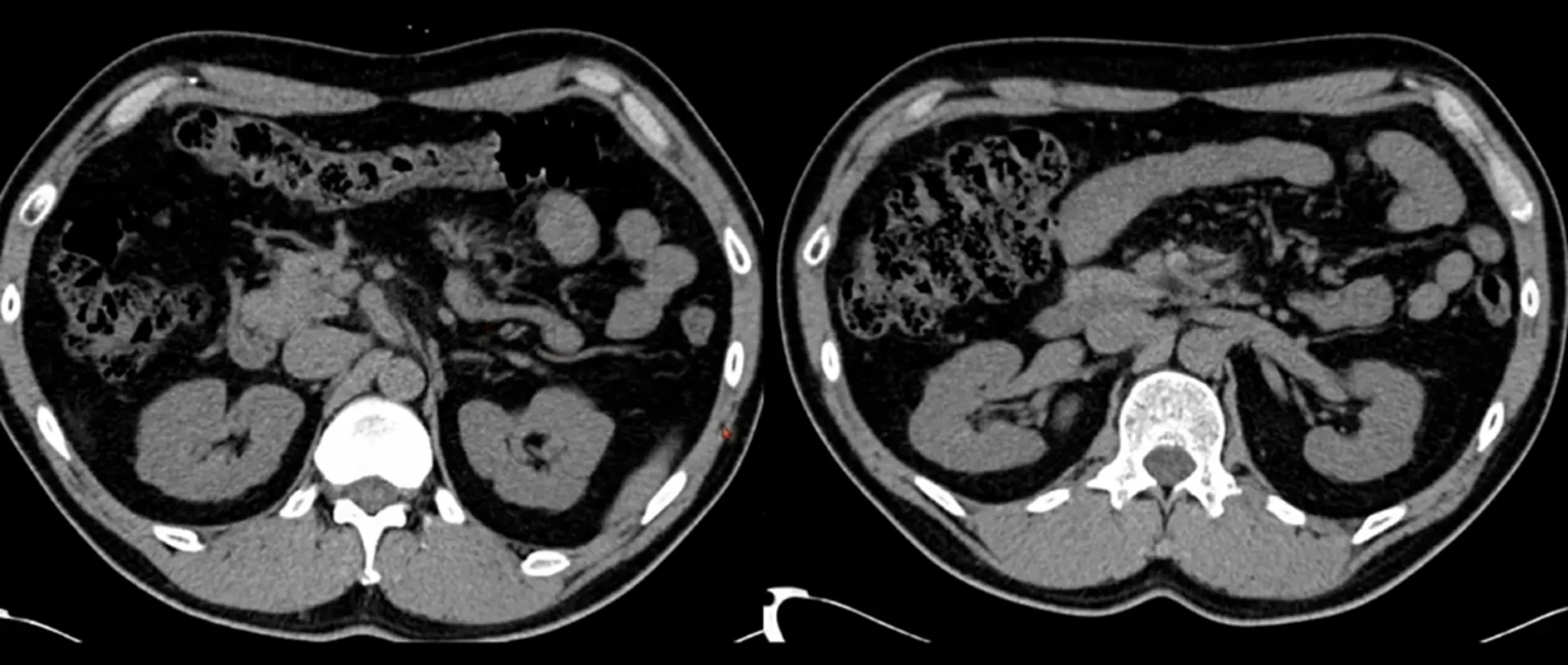 Aggravation of abdominal pain ⇒ F/U with non-contrast CT