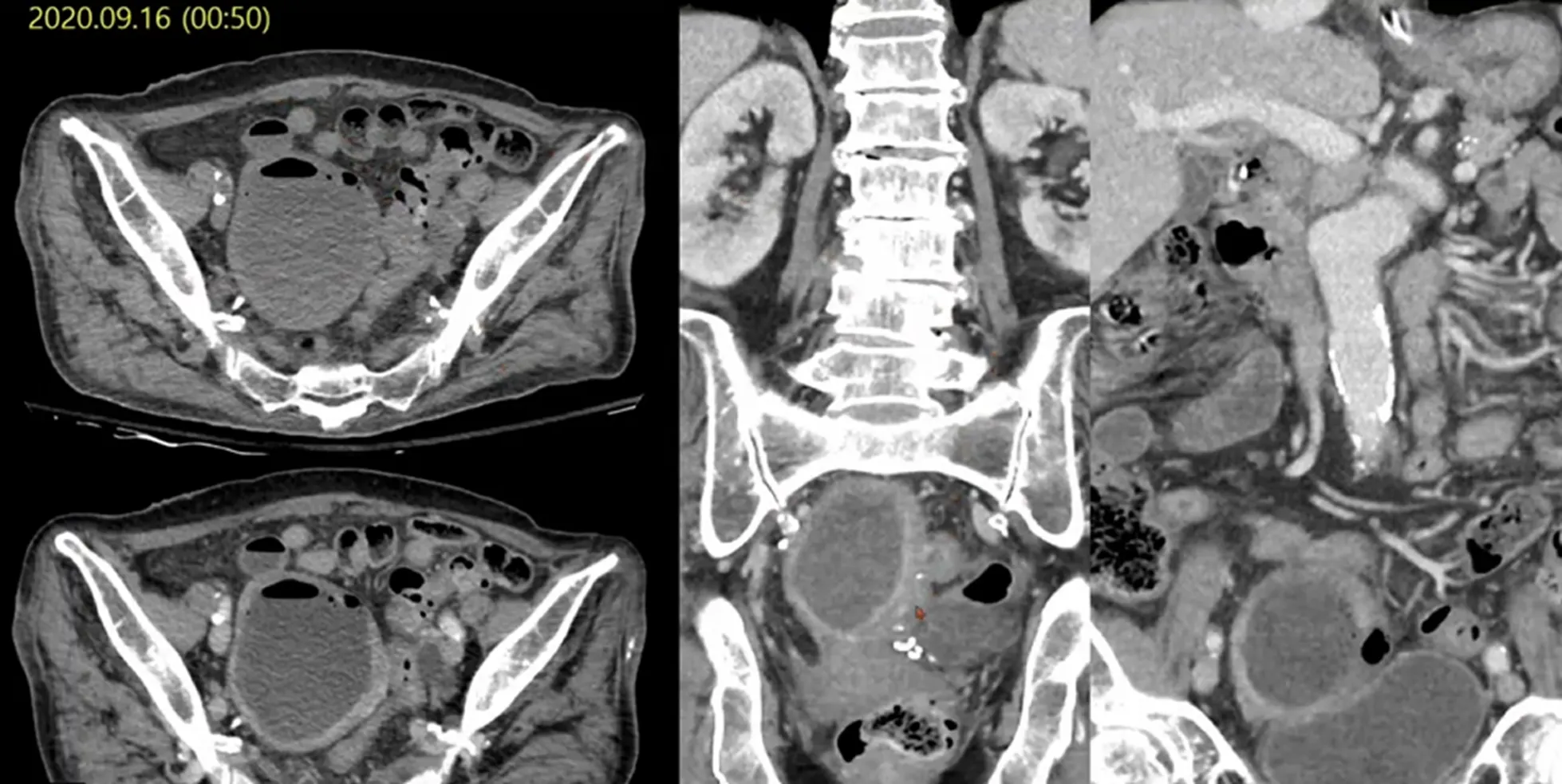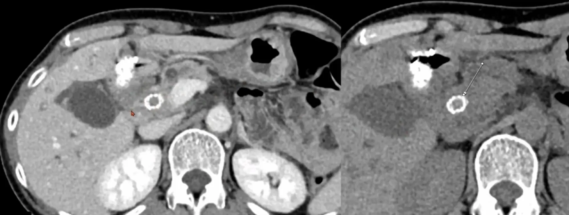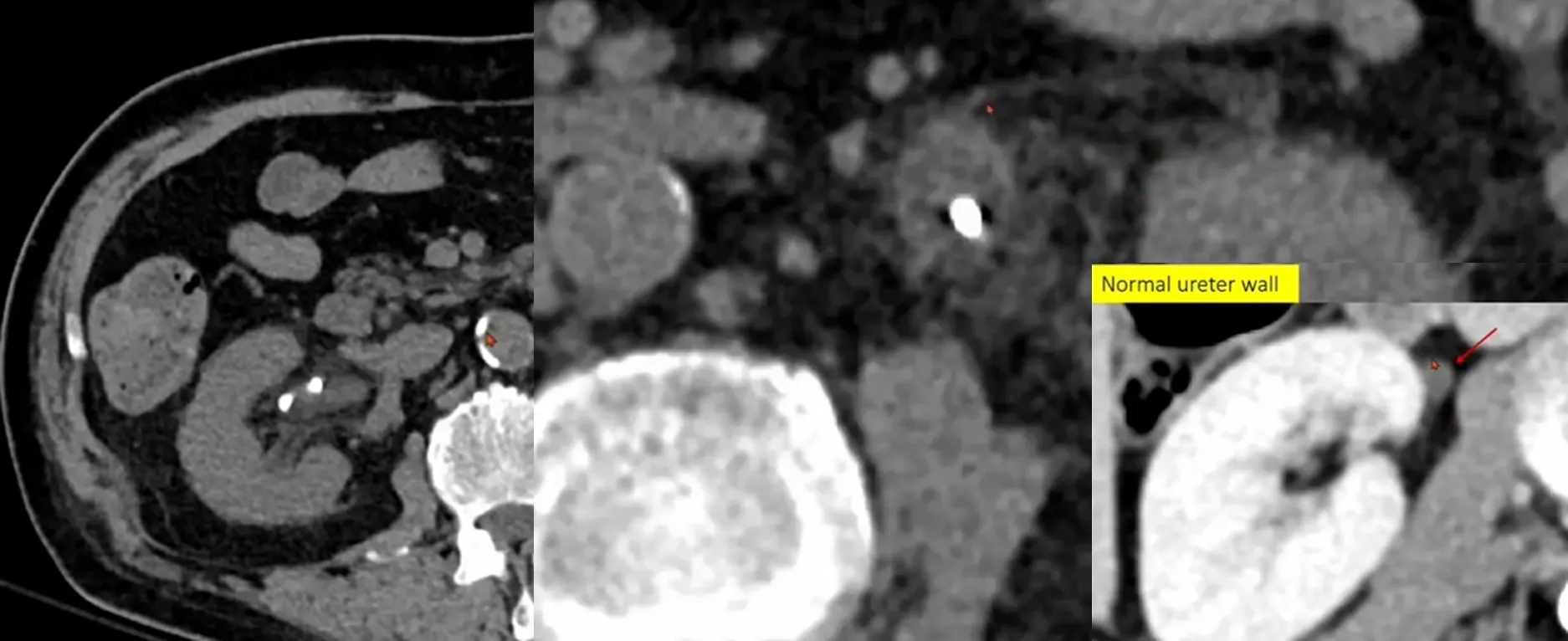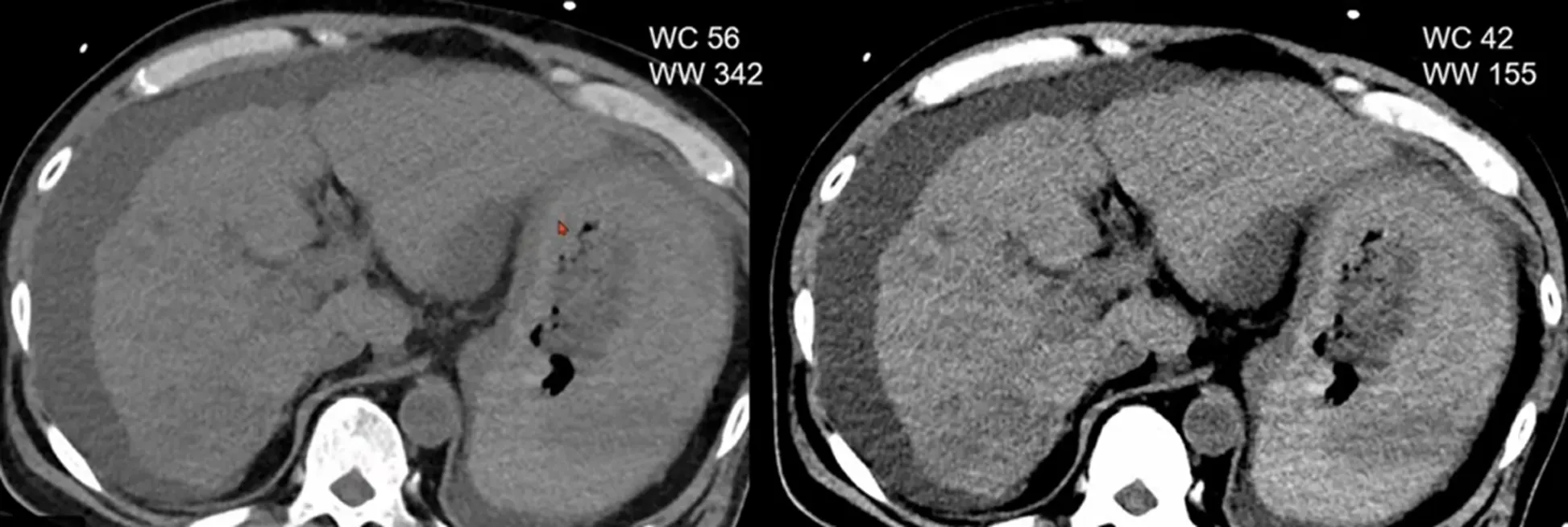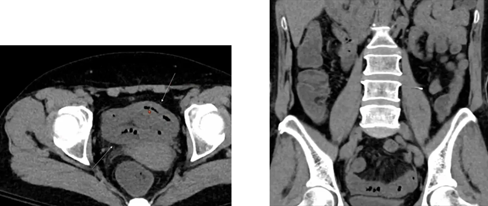Aggravation of abdominal pain ⇒ F/U with non-contrast CT