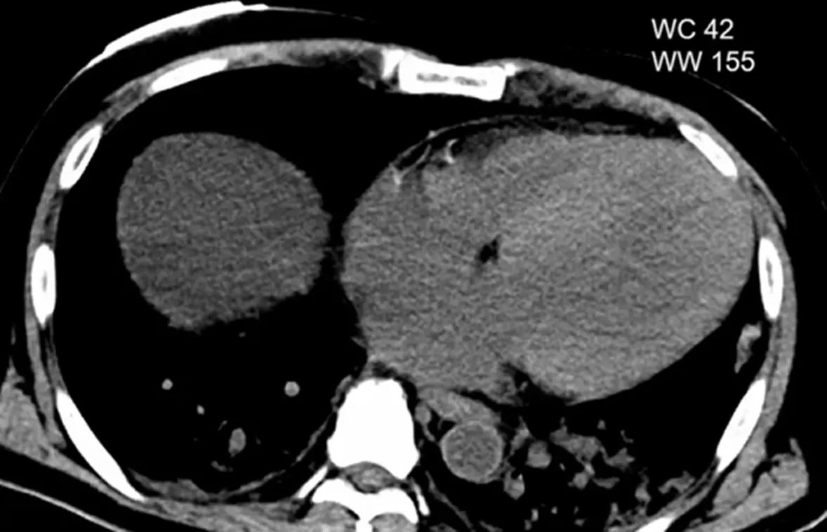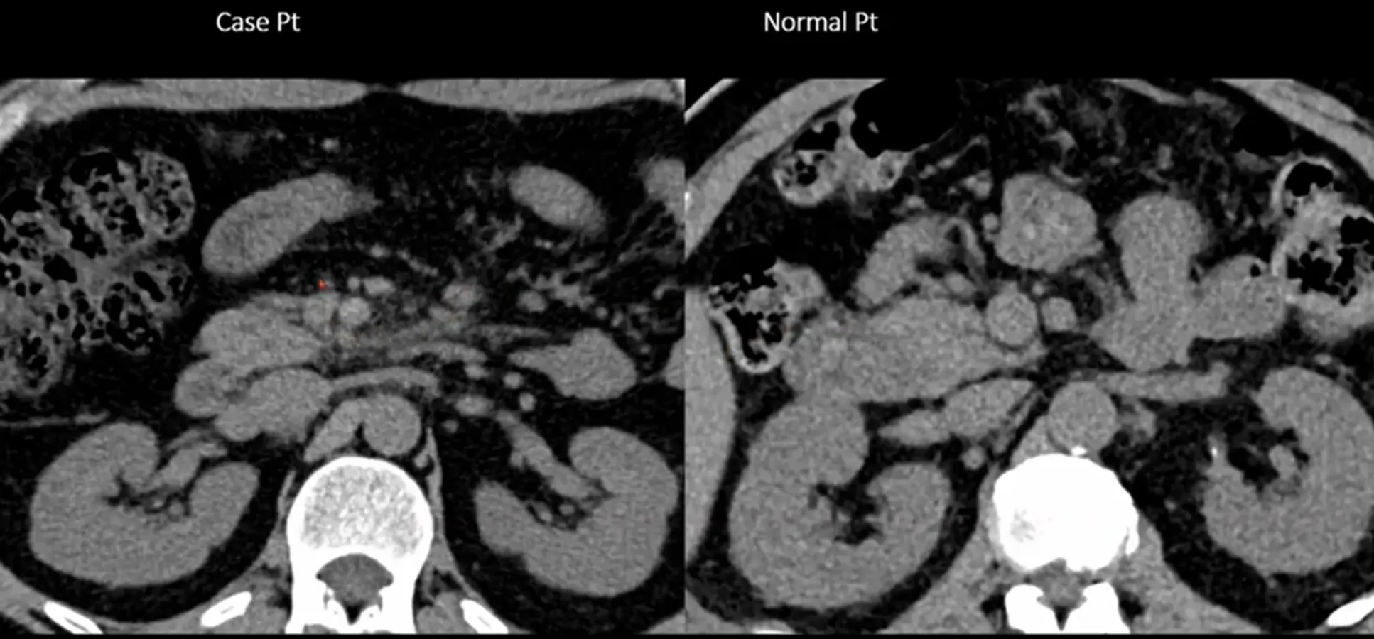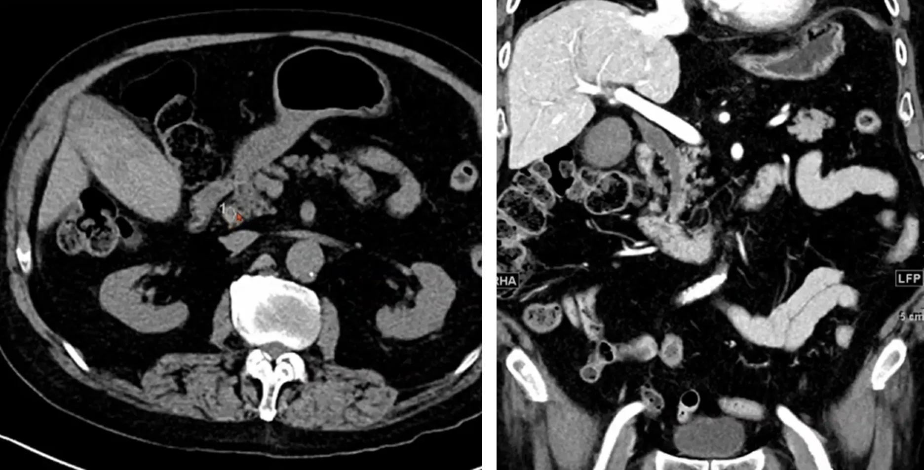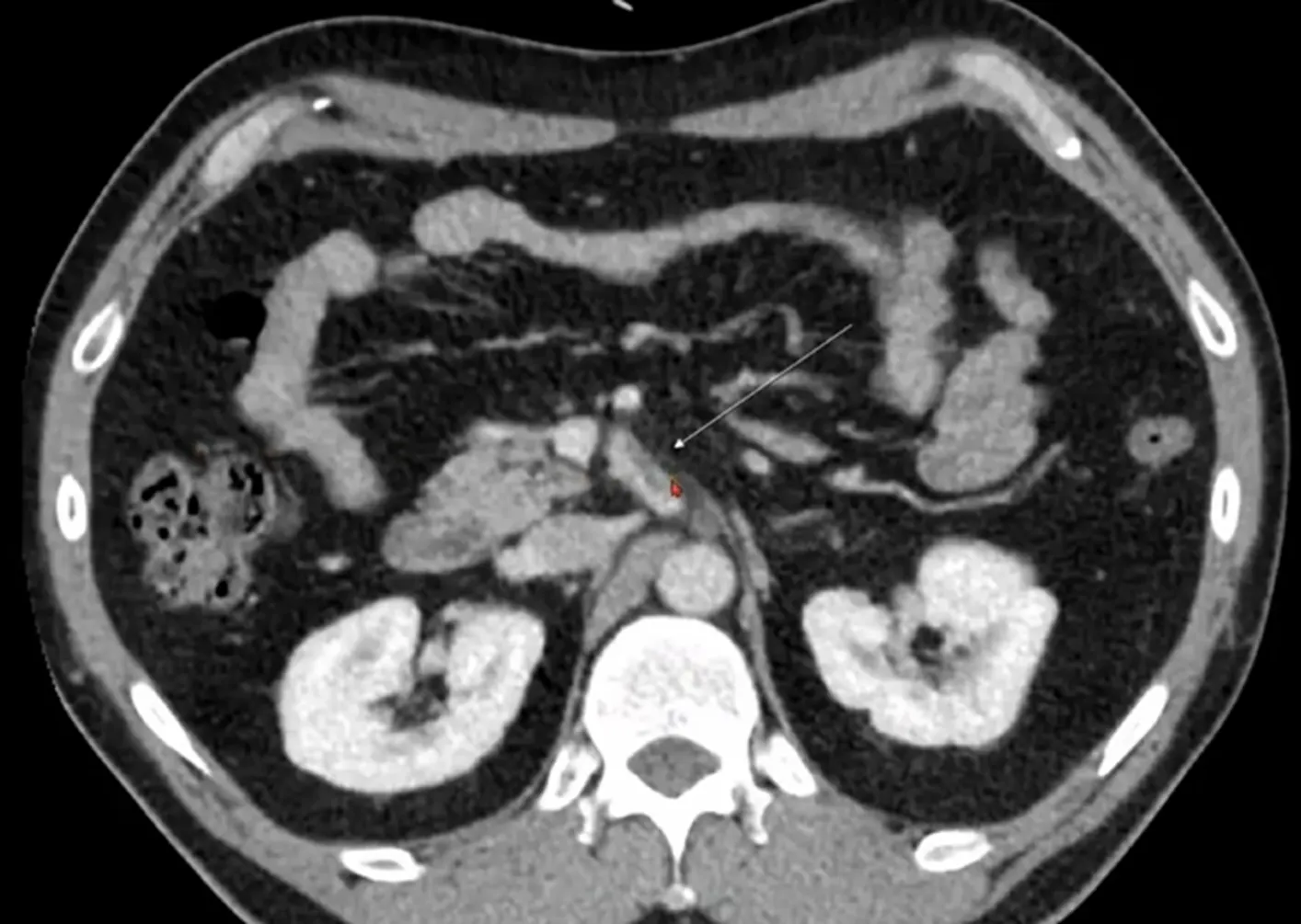 Aggravation of abdominal pain ⇒ F/U with non-contrast CT
