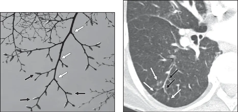 경계가 분명한 2~4 mm 크기의 nodules 또는 branching