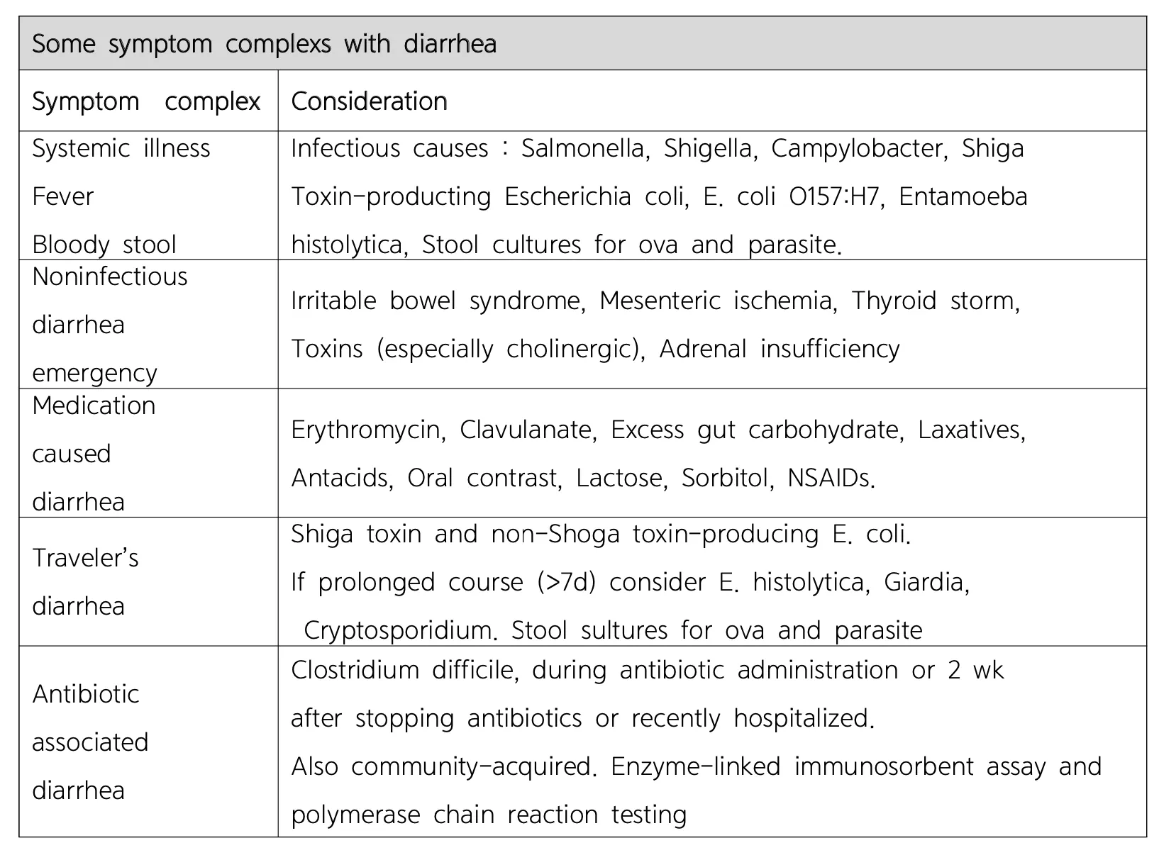 영양공급 : 음식에 의해 유발된 설사 이외에는 금식 필요없다.