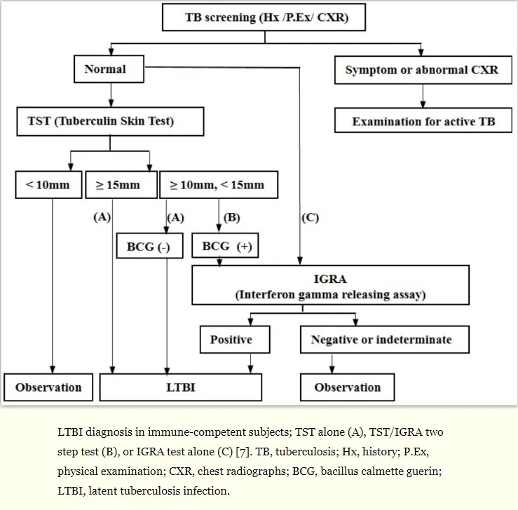결핵감염검사인 투베르쿨린 검사(일반환자 TB skin test, 피부반응검사-결핵)와 IGRA (일반환자 IGRA plus) 는 활동성 결핵과 잠복결핵감염을 구별할 수 없으므로 활동성 결핵의 진단을 위해 사용하는 것은 권고하지 않는다(ID).