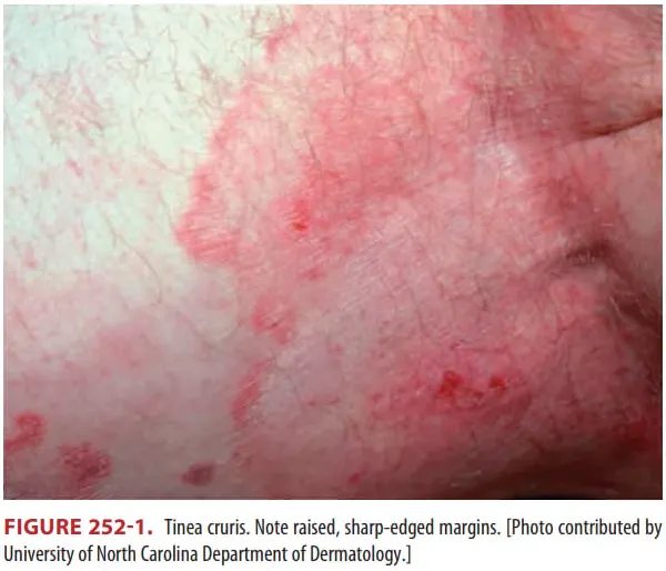완선(jock itch)이라고 불리는 사타구니의 진균감염. 남성에게 흔하다.